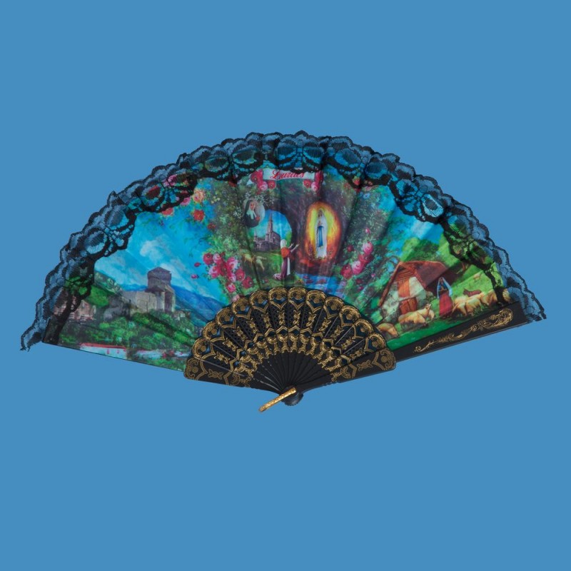 Très bel éventail en tissu avec dentelle et armatures en plastique, avec représentation de l'Apparition de Lourdes, la ferme de Bartrès et Bernadette, le château fort. Dimensions ouvert : 45 cm x 20 cm