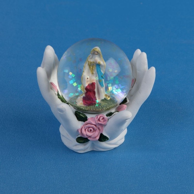 Boule de neige en verre avec l'Apparition de Lourdes, posée dans les mains en résine légère avec des roses, représentant l'églantier de la grotte de Lourdes. Hauteur 7 cm
