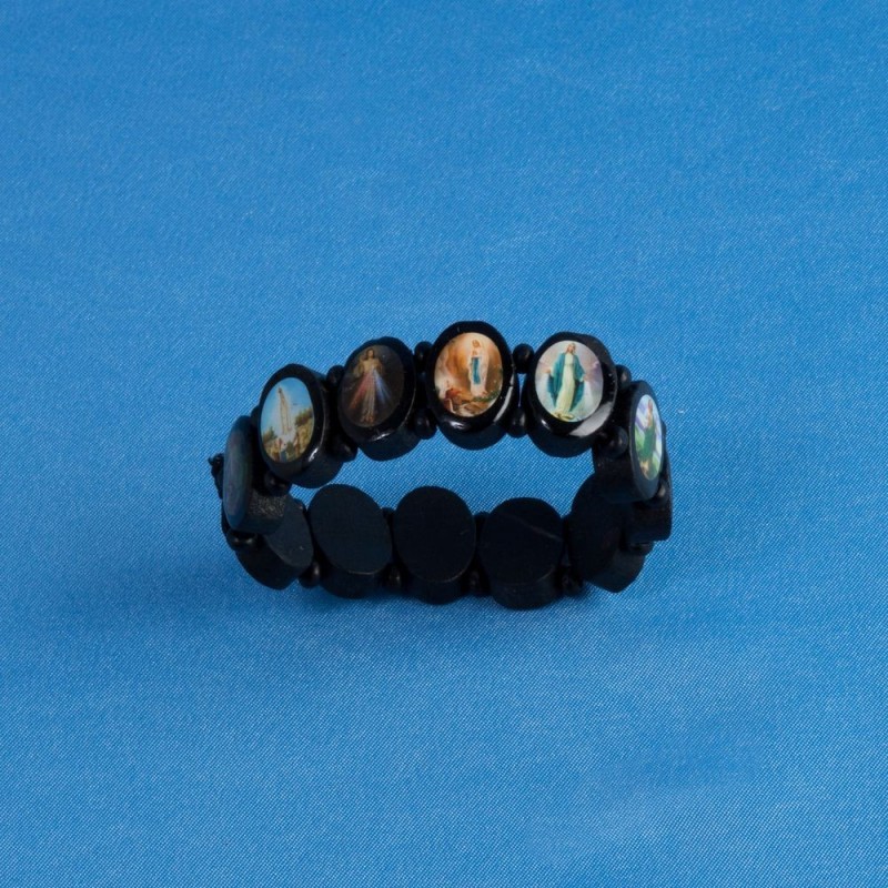 Un tout petit prix pour ce bracelet en bois de couleur accajou, sur cordon élastique avec représentation de divers Saintes et Saints.