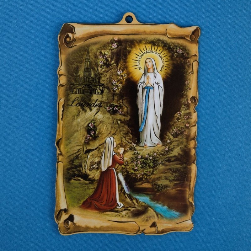 Cadre en bois à suspendre, façon parchemin représentant l'Apparition de Lourdes en couleur. Dorures sur les contours du cadre ainsi que sur l'ensemble des détail du cadre. 15 cm x 10 cm. Autres dimensions disponibles : 19 cm x 13 cm et 22 cm x 16 cm