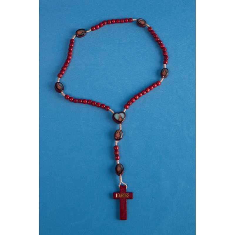 Chapelet monté sur corde tressée avec grains 5 mm en bois de couleur rouge avec médaillons Sacré Cœur de Jésus. Longueur 36 cm