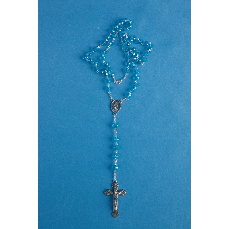 Chapelet avec fermoir, grains 9 mm en verre transparent de couleur bleue style Swarovsky. Longueur 55 cm
