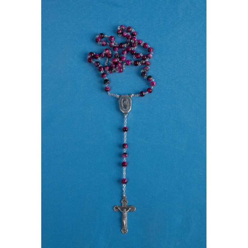 Chapelet avec grains 8 mm en pierre de couleur rose avec la goutte d' eau de Lourdes. Longueur 55 cm ; Autres couleurs disponibles : bleu, vert.