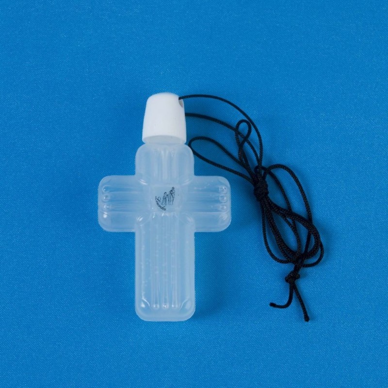 Croix en plastique avec médaillon représentant l'Apparition de Lourdes. Cette croix est rempli d'eau de la Grotte de Lourdes gracieusement offerte. Contenance 4 cl.