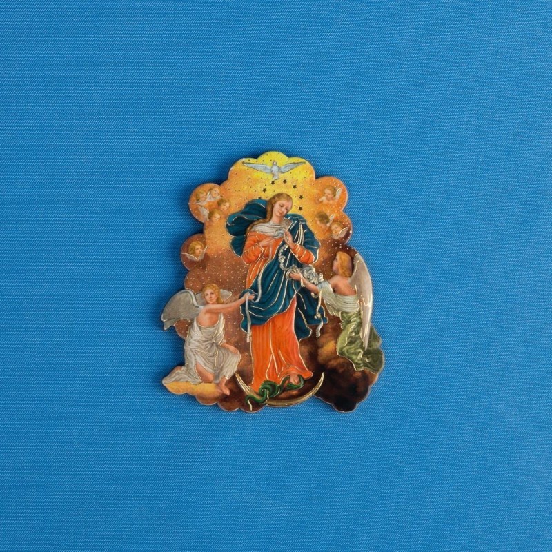 Magnet en bois représentant Marie qui défait les nœuds, bord doré. 7 cm x 5,5 cm
