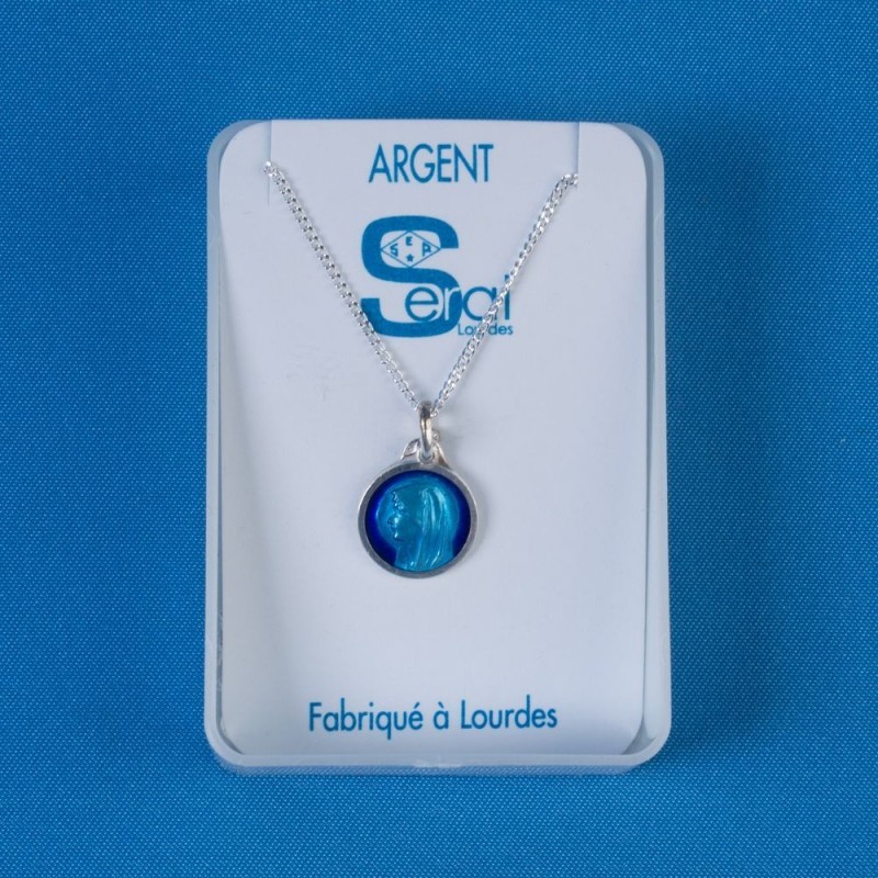 Parure en argent 925/1000ème avec médaille ronde 1,5 cm, représentant le visage de la Vierge sur émail bleu, avec au dos l'Apparition de Lourdes. Dimension de la chaîne : 45 cm