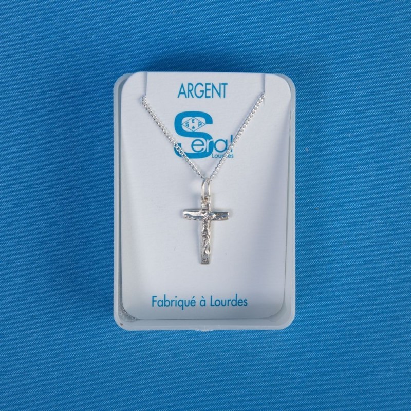 Parure en argent 925/1000ème avec médaille 2 cm x 1 cm, représentant le Christ sur la croix. Dimension de la chaîne : 45 cm