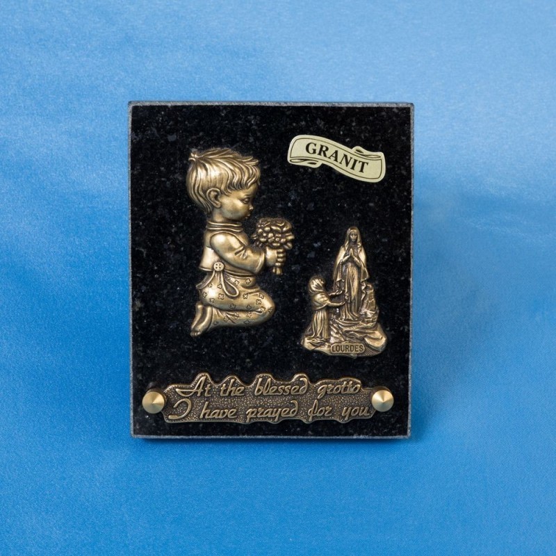Plaque en granit noir, avec un petit garçon et son bouquet de fleurs devant l'Apparition, en bronze. Plaque fabriquée à Lourdes. 20 cm x 15 cm. Inscriptions disponibles : - A la grotte bénie, nous avons prié pour toi - A la grotte bénie, j'ai prié pour toi - Souvenir de Lourdes