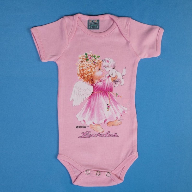 Body 100% coton, blanc, avec sérigraphie d'une petite fille avec un chaton, Lourdes. Autres tailles disponibles : 0-3 mois, 6-12 mois, 18-24 mois