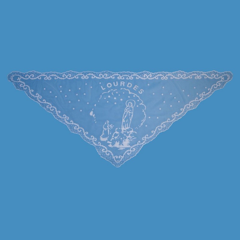 Grande mantille blanche pour la prière, en tule 100% polyester et flocage velours tout le tour et pour l'Apparition de Lourdes. Dimension : 110 cm x 45 cm Disponible en noir